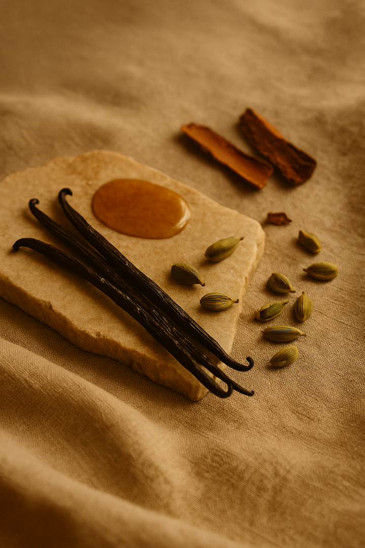 Unrefined Mango Butter, Unrefined Kokum Butter, Unrefined Murumuru Butter, Unrefined Cupuacu Butter, Organic Infused Jojoba Oil (Chamomile, Vanilla Bean, Calendula), Organic Pomegranate Seed Oil, Arrowroot Powder, Vitamin E, Organic Essential Oils (Cardamom CO₂, Vanilla CO₂ 10%, Benzoin, Clove Bud and/or Cinnamon Leaf)