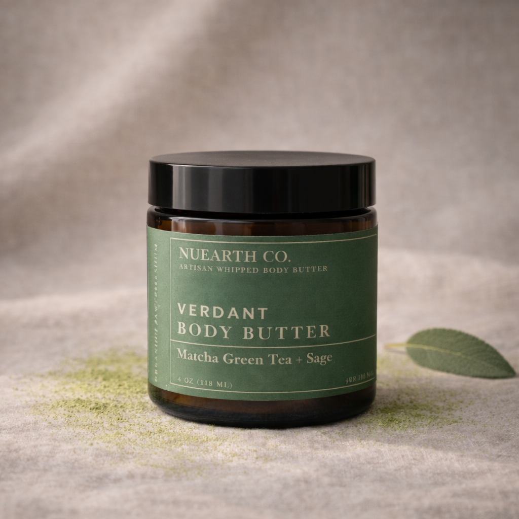 Ingredients: Mango Butter, Kokum Butter, Murumuru Butter, Cupuacu Butter, Infused Oil (sage and oatmeal in jojoba oil), Organic Pomegranate Seed Oil, Oat Oil, Arrowroot Powder, Vitamin E, Matcha Green Tea Powder (ground and sifted), Bergamot Essential Oil, Sandalwood Essential Oil, Sage Essential Oil.